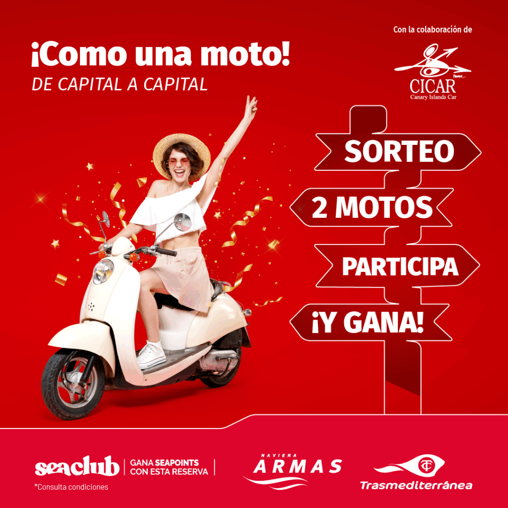 El Grupo Armas Trasmediterránea lanza, en colaboración con la compañía Canary Islands Car (Cicar), una acción promocional con el sorteo de dos ciclomotores de 125 cc entre los clientes que viajen este verano entre las islas de Gran Canaria y Tenerife. Esta iniciativa estará activa hasta el 30 de septiembre y podrán participar todas las personas que compren y realicen su travesía en esta ruta hasta la fecha mencionada.