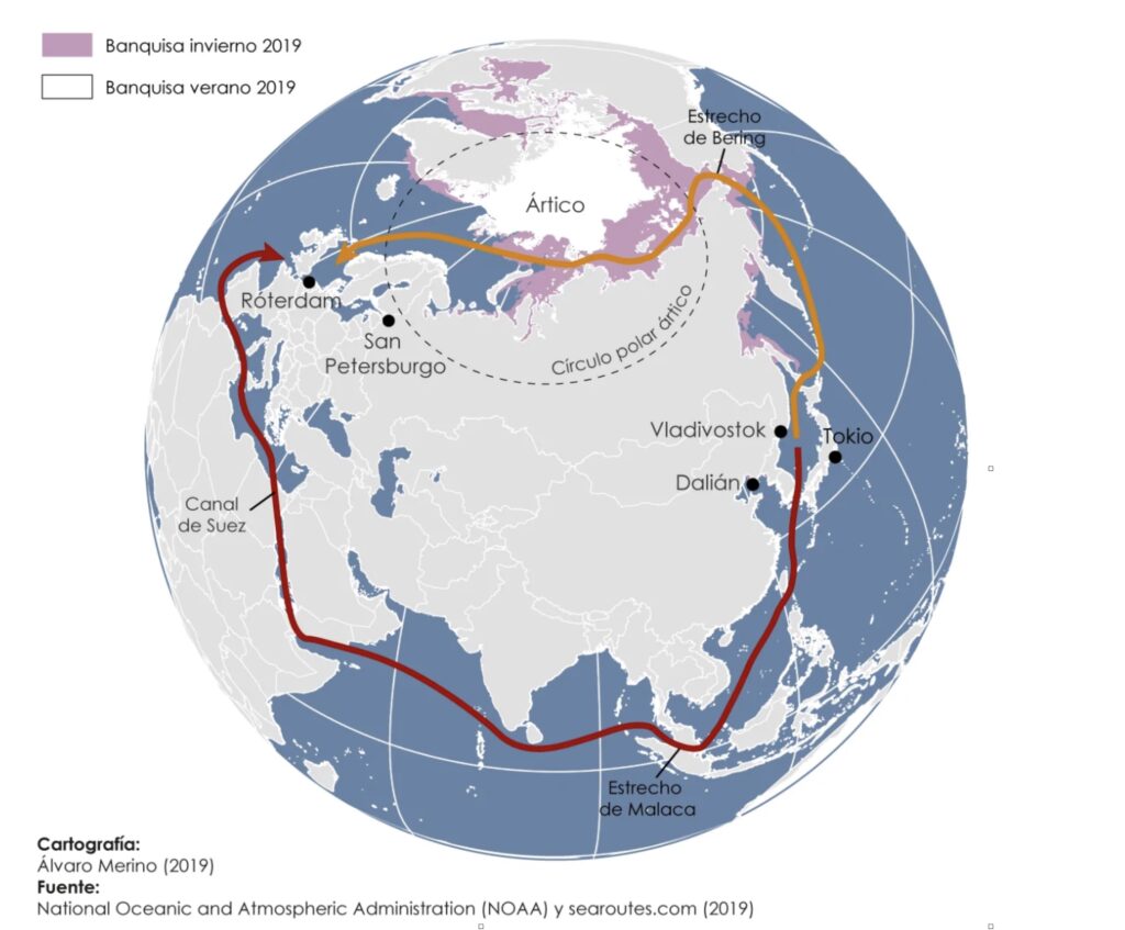 El deshielo de la zona ártica, abre una ventana de oportunidad para las rutas marítimas, que hace unos años eran totalmente inviables. La iniciativa de Haijie Shipping, pretende establecer un servicio regular con varias escalas, operando entre los meses de julio y noviembre, en principio, cuando el deshielo lo permite. China, además de dotarse de una creciente flota de rompehielos, ha implementado un sistema de monitoreo del hielo marino en tiempo real, que es controlado desde varias estaciones científicas en el Círculo Polar, que reportan datos a los buques. El trayecto, bautizado como “China-Europe Artic Express”, reduce a la mitad el tiempo de navegación, en comparación con la alternativa por Suez.