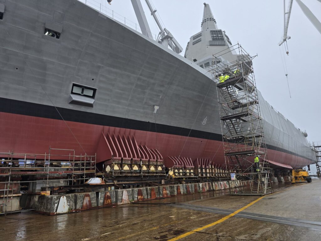 El buque fue botado sin propulsión, y ya ha entrado remolcado en dique seco, donde estará hasta principios del año próximo. En esta varada se instalarán las palas de las hélices, los timones, las aletas estabilizadoras, y el domo del sonar. Este último se encuentra ubicado en el único bloque (de 33) que quedó sin montar en la botadura por motivos de seguridad.