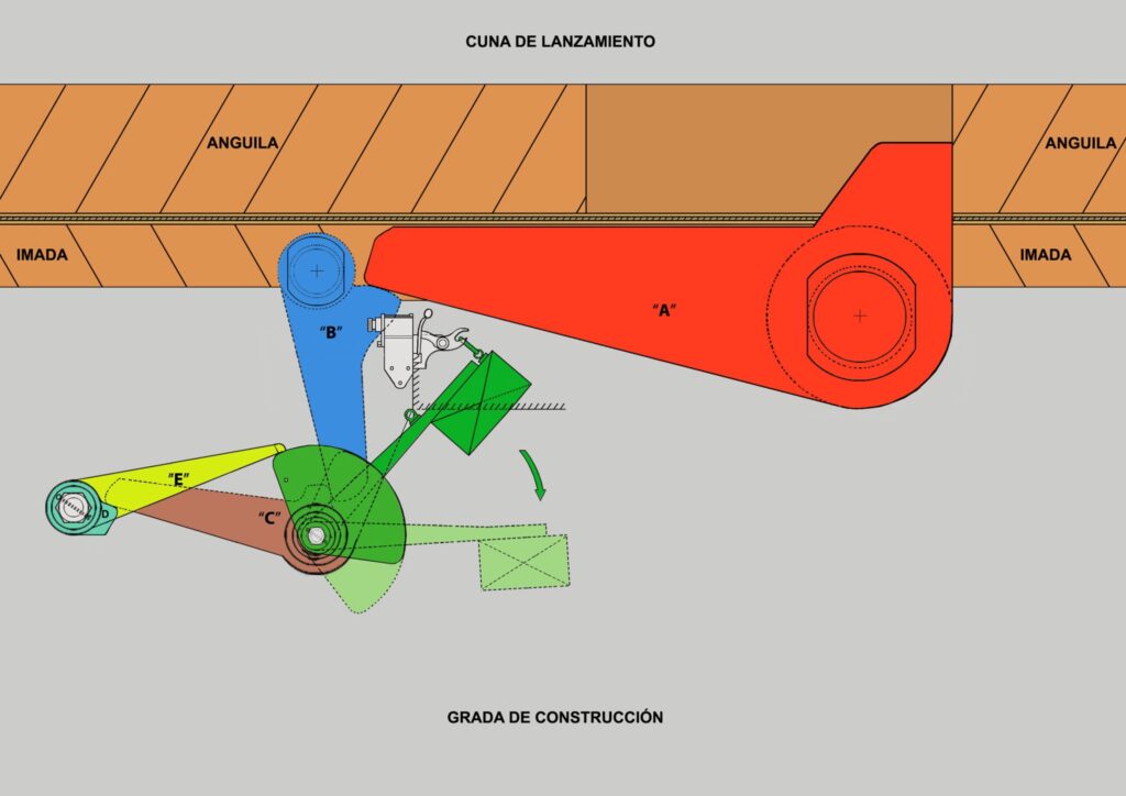 Previamente al inicio de la construcción del buque en la grada, se sitúan las llaves de retención mecánica de babor y estribor. Las llaves móviles o palancas de retención mecánica se instalan en su posición definitiva, antes de la instalación de la retenida móvil (anguila móvil que marcará la posición definitiva del resto de las anguilas. Estos elementos parecen una especie de vagones de tren, unidos, sobre los que descansa el buque). Las dos llaves, una por cada costado del buque, están diseñadas por un juego de seis palancas, desmultiplicadores de fuerza, que permiten que un simple solenoide pueda liberar el buque en el movimiento de la última palanca (la roja en la figura), para que se efectúe el lanzamiento.
