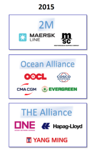 Cuando Maersk y MSC decidieron en 2015 aliarse en el 2M, la competencia quedó otra vez retrasada. El concepto, imitando el patrón de Code-Sharing de las aerolíneas, optimiza costes y genera economías de escala, pudiendo gestionar las rutas y buques disponibles de manera más eficiente que en un Stand-alone. En 2017, la competencia reaccionó estableciéndose con urgencias Ocean Alliance (CMA-COSCO-OOCL-EVERGREEN) y THE Alliance (Hapag-Lloyd, Yang-Ming y las japonesas integradas en ONE: NYK, MOL y K-Line) para contrarrestar el efecto del 2M, líderes del mercado. Estas 3 alianzas navieras suponían el 80% de la carga.