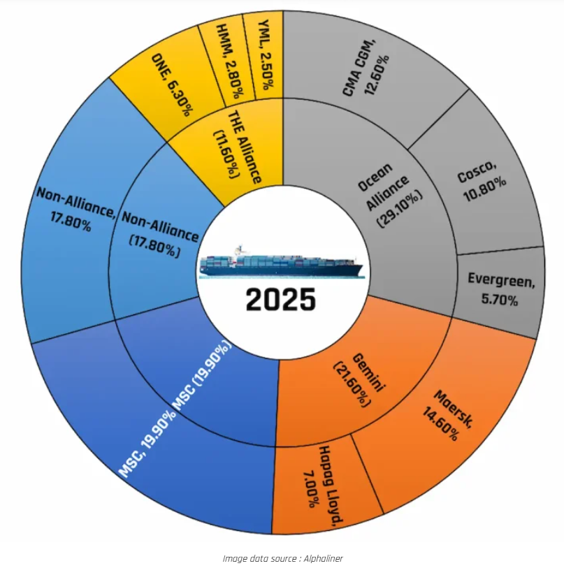 Hoy, tras una década funcionando bajo el modelo de alianzas marítimas, estamos frente a una nueva restructuración de la oferta, con una reconfiguración de las alianzas. A partir de 2025, MSC, el mayor operador con 801 buques con una capacidad de 5,7M de TEUS se independiza. Más que un stand-alone propiamente dicho, parece que la idea es colaborar con THE Alliance, manteniendo los acuerdos de colaboración como el de ZIM para el tráfico Transpacífico. Ante tal situación, Maersk ha unido fuerzas con Hapag-Lloyd para establecer la nueva GEMINI Alliance.