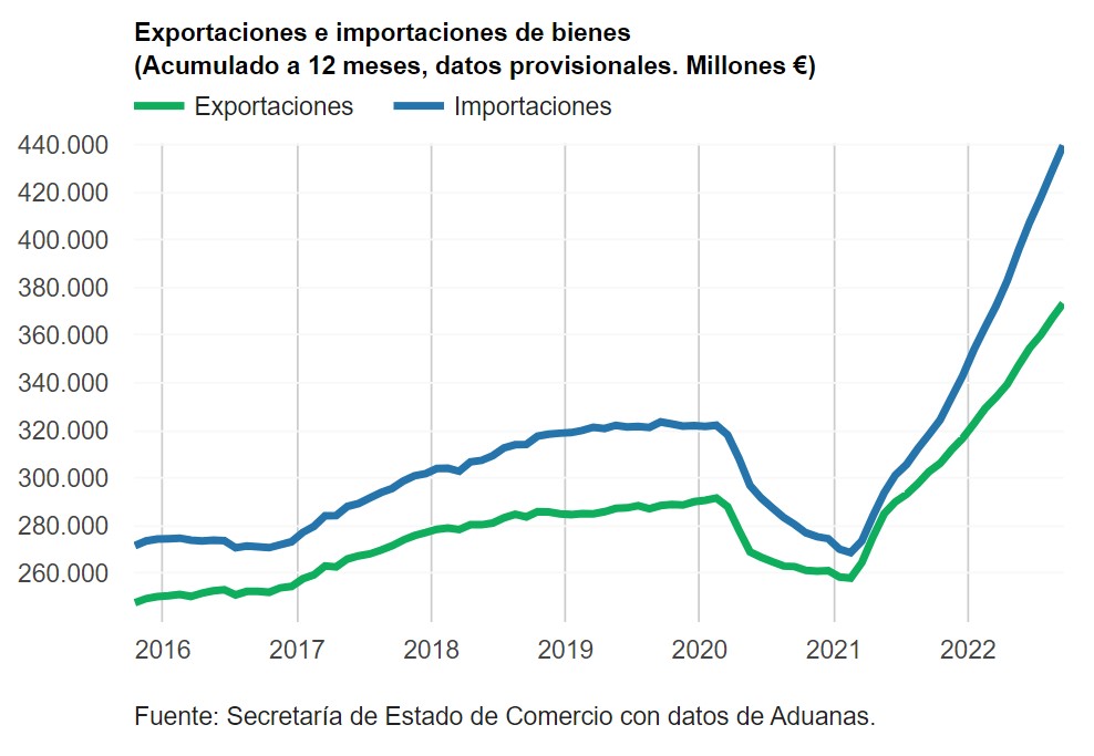 Las exportaciones españolas de mercancías ascendieron un 24,7% en el periodo de enero a septiembre de 2022 respecto al mismo ciclo del año anterior y alcanzaron los 286.673 M€, marcando un nuevo máximo histórico. Las importaciones se incrementaron un 39,8% hasta los 340.111 M€, también máximo histórico.