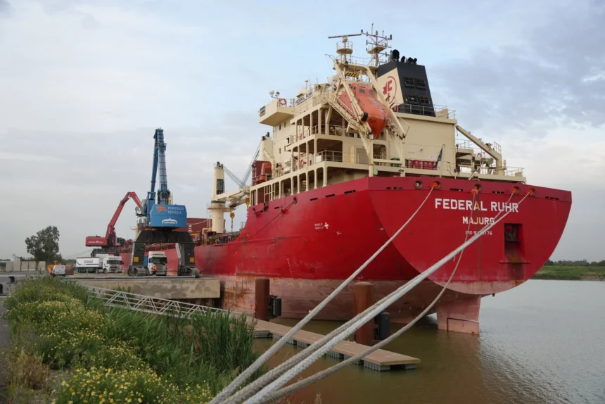 Llega al Puerto de Sevilla el buque granelero FEDERAL RUHR, uno de los buques de mayores dimensiones que ha operado hasta la fecha en las instalaciones portuarias. Con 199 metros de eslora, este buque comenzó ayer la descarga de 11.000 toneladas de trigo en la terminal de Aldeport, inaugurada en 2024 y gestionada por los grupos Portillo y Ership. Este nuevo muelle situado al sur, en la dársena del Cuarto, está especializado en la logística del cereal y combina el atraque en primera línea, con los almacenes y los desarrollos industriales, en segunda, lo que facilita la logística de la mercancía hasta el destino final.