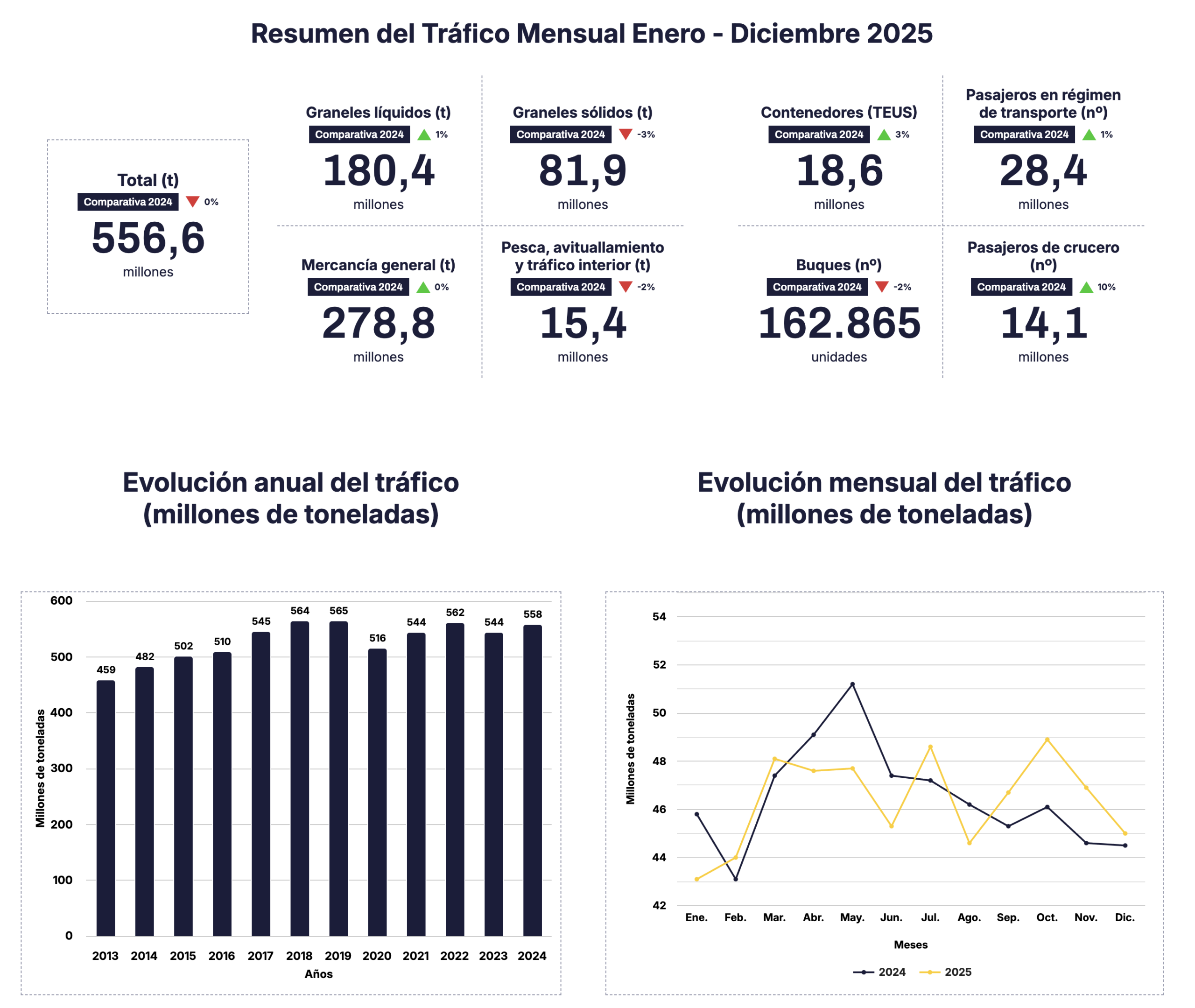 Los puertos de interés general movieron 556.584.674 toneladas en 2025, lo que supone un leve descenso del 0,2% respecto a 2024 (557,7 millones), según datos provisionales de cierre.