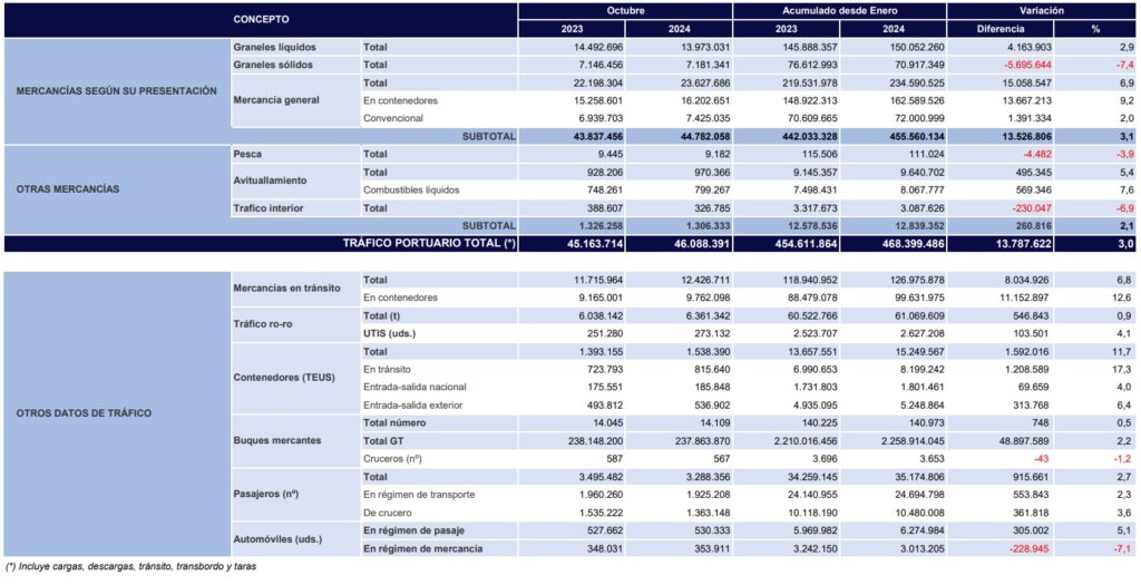 Los puertos de interés general españoles movieron entre enero y octubre de 2024 un total de 468.399.486 toneladas, lo que representa un incremento del 3% respecto al mismo periodo del año anterior, en línea con los datos registrados durante lo que va de año, efecto de la situación coyuntural mundial, según se desprende de las estadísticas hechas públicas por el organismo público Puertos del Estado.