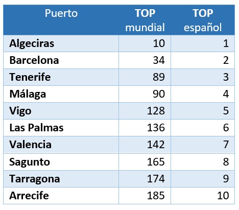 A nivel español, y tras Algeciras están Barcelona (2º), Tenerife (3º), Málaga (4º), Vigo (5º), Las Palmas (6º), Valencia (7º), Sagunto (8º), Tarragona (9º), y Arrecife (10º)