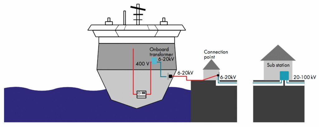Un sistema de conexión eléctrica “OPS” requiere la instalación de una infraestructura que esté dotada de una conexión a la red eléctrica nacional, que suministre altos voltajes (20-100 kV); una subestación local que transforme los voltajes (6-20 kV); y un convertidor de frecuencia (opcional) ya que, aunque la frecuencia con la que se trabaja en España y Europa es de 50 Hz, muchos buques usan el estándar americano de 60 Hz.