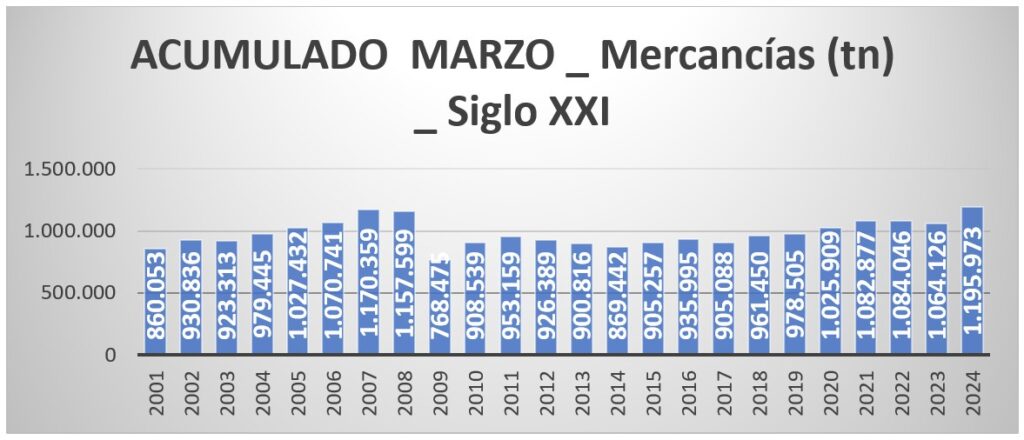 Si nos referimos exclusivamente a la mercancía general, sin incluir los graneles, los porcentajes de incremento todavía son mejores: +24,9% en el mes y +17,55% en el trimestre.