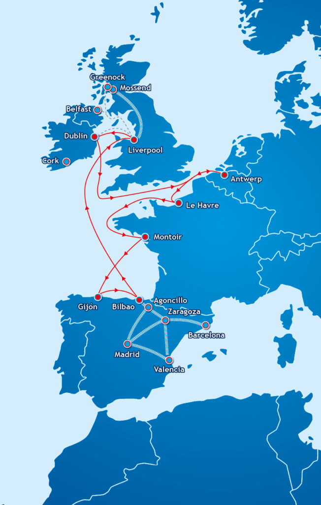 Los puertos de escala incluyen Amberes, Le Havre, Montoir, Bilbao, Gijón, Liverpool y Dublín
